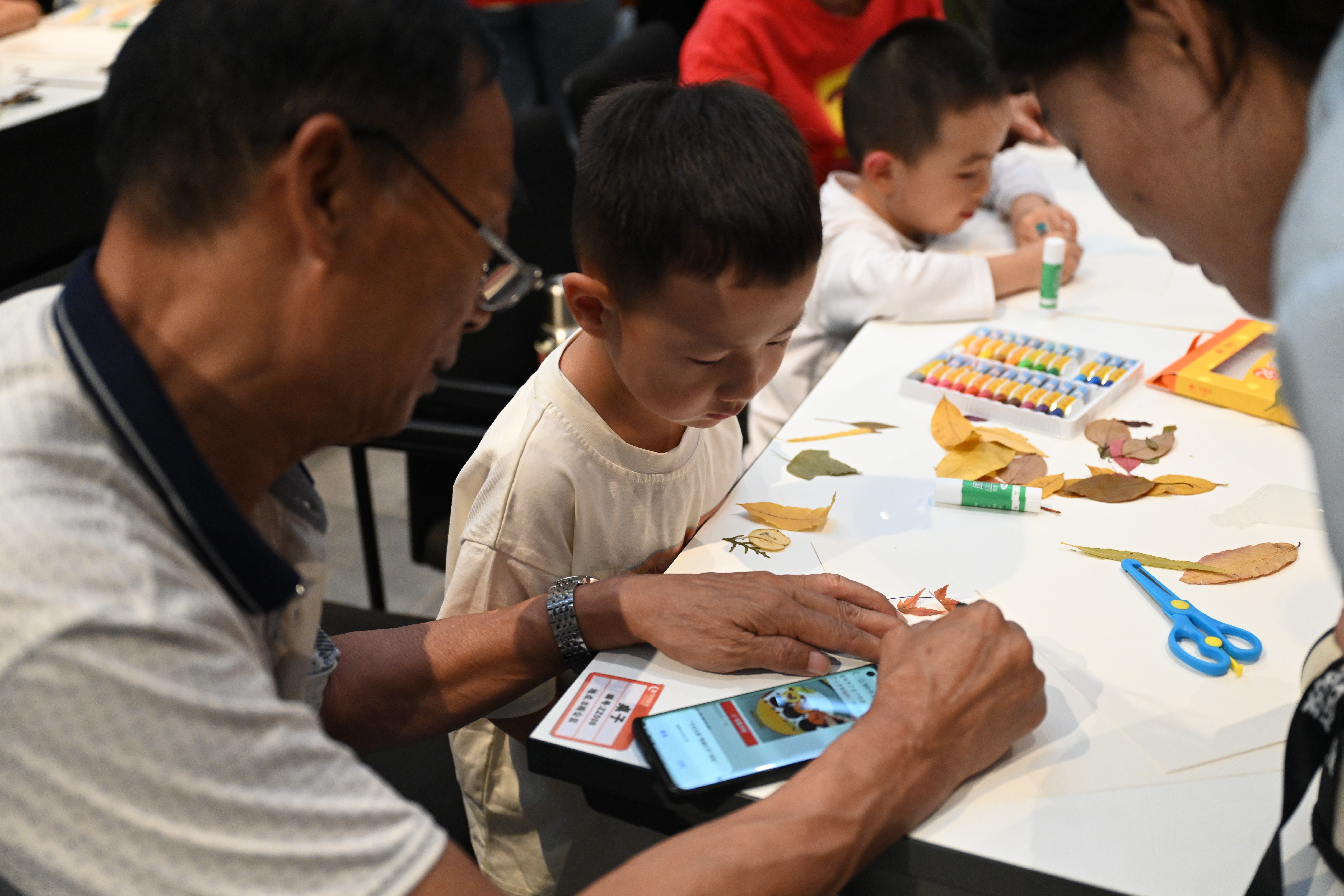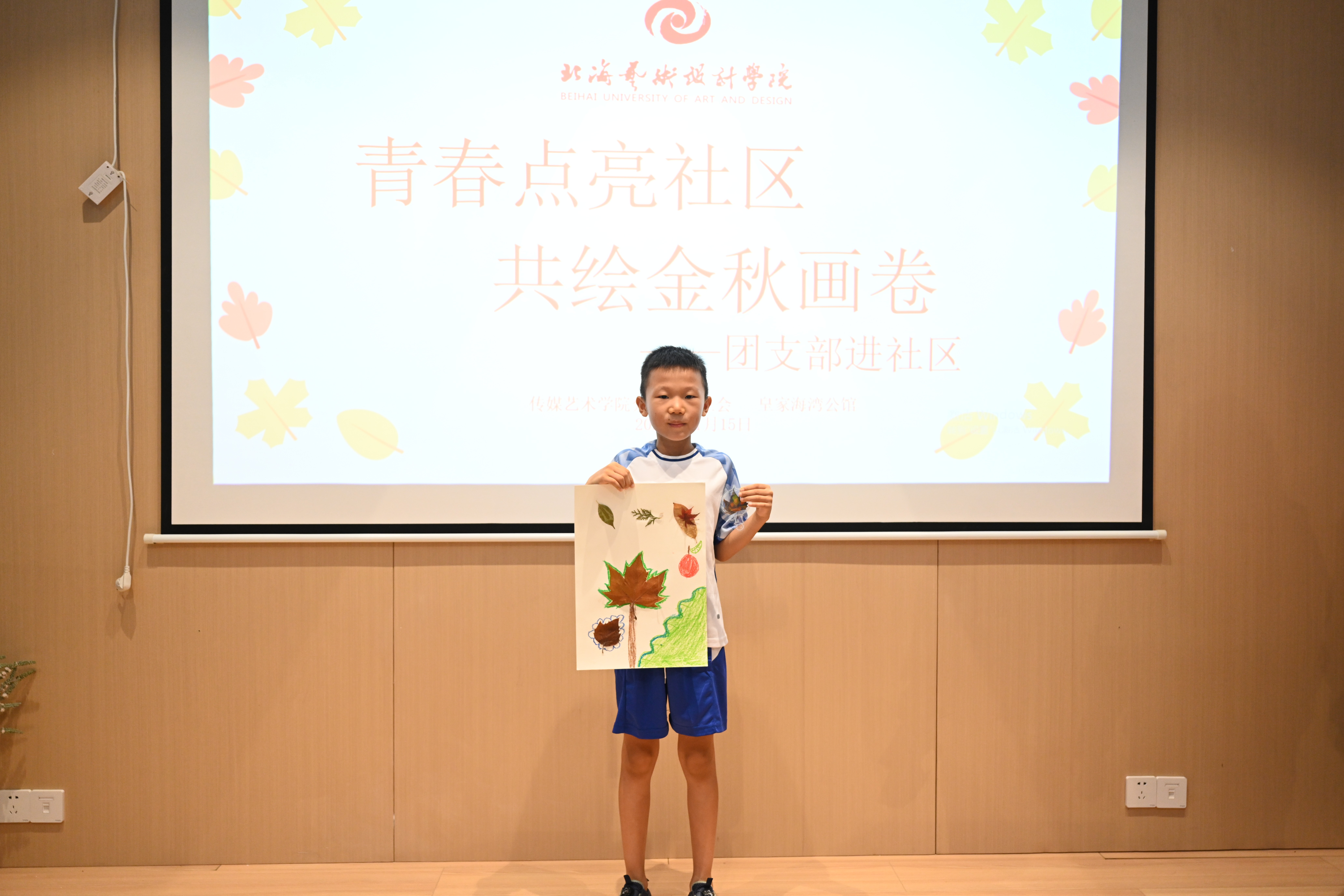 “亲子绘画”环节在社区共享会议室温馨开启。传媒艺术学院的志愿者们充分发挥专业特长,化身“艺术导师”,耐心引导小朋友们展开想象,在洁白的画纸上共同描绘秋天的故事。以“我眼中的秋天”为主题,孩子们在志愿者一对一陪伴下,挥洒童真色彩——金黄的落叶、高远的蓝天、欢笑的家人、嬉戏的身影……一幅幅充满生命力的图景在画笔下渐次绽放。原本静谧的会议室,化作一片流动的色彩海洋,洋溢着童趣与温暖的创作气息。