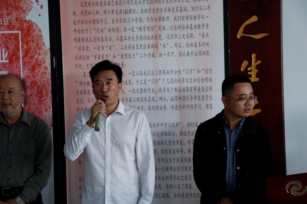 北海市美术家协会主席肖畅恒讲话,他表示很高兴能与北海的高校进行互动,并预祝本次展览成功。