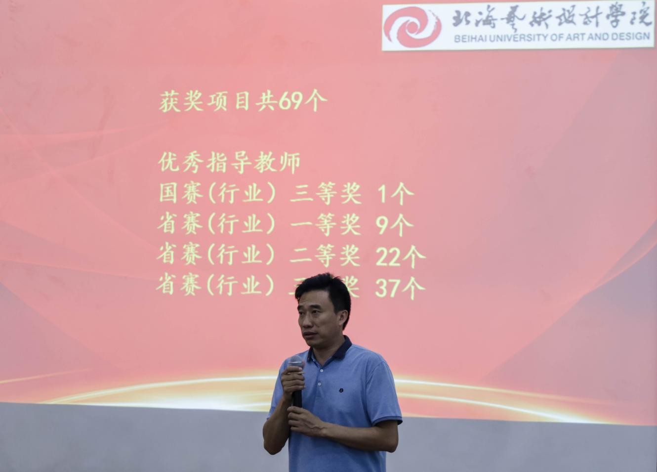 典礼第三项,北海艺术设计学院建筑与环境艺术学院院长王照伟讲话。王照伟院长强调到教育事业发展事关民生福祉、涉及千家万户,全体教职工要坚定信心,创先争优,全力以赴做好新时代教育工作,努力办好人民满意的教育;要不忘立德树人初心,对获奖教师给予了充分的肯定和高度的赞扬。并表示希望全体教师在今后的工作中积极进取、敬业爱岗、严谨治教,牢记为党育人、为国育才使命,为党和国家培养更多堪当大任之才。