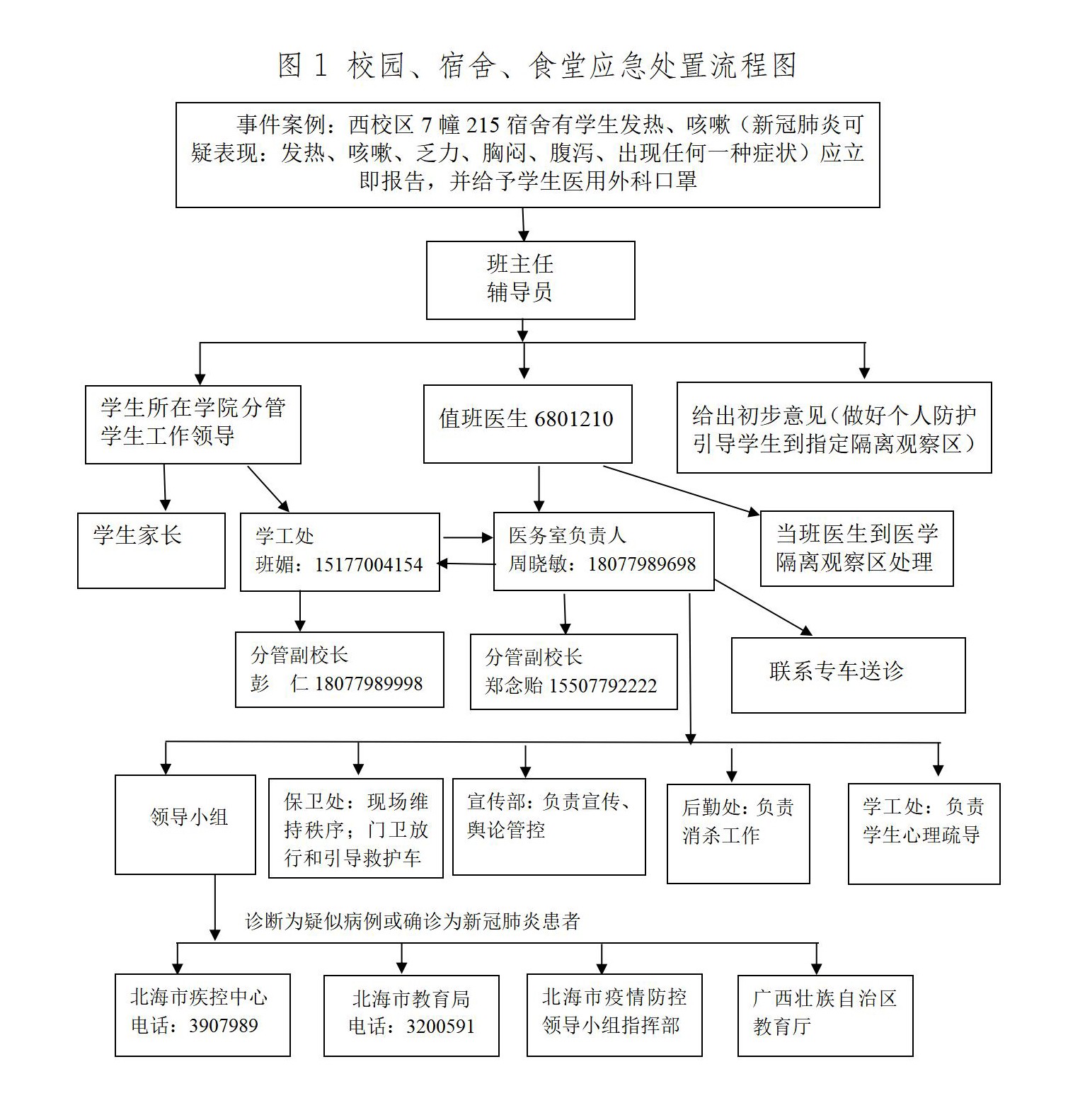 6.扎实做好疫情应对准备。加强与自治区教育厅、北海市教育局、北海市卫生健康部门、辖区医院的沟通与协作,获取专业指导,加强联防联控;按照属地管理原则,加强与北海市卫生健康委、北海市疾病预防控制中心、北海市银海区新冠疫情防控指挥部、辖区医院的联系,建立协调联络机制。一旦发生疫情,须严格依法依规报告,及时启动应急处置预案,落实相关处置措施。