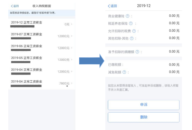如您认为某条收入信息非本人取得,可对收入明细数据进行【申诉】、【删除】。