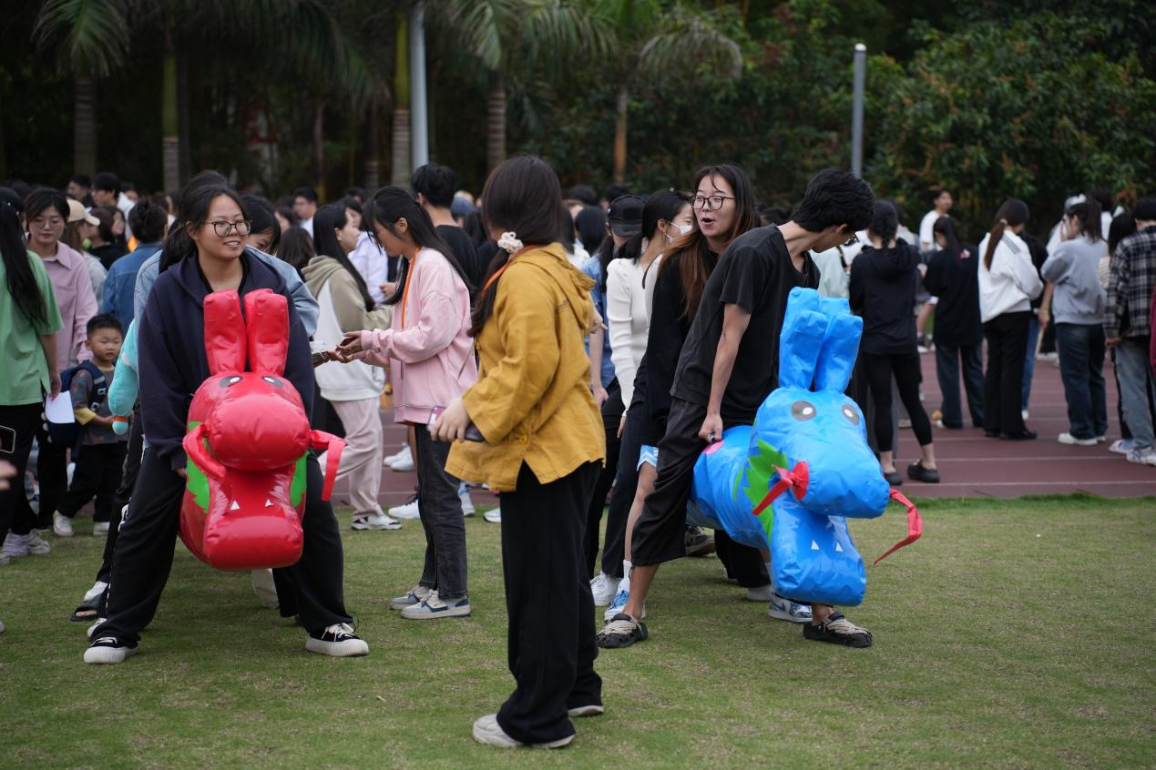 当天,学院师生身着各民族服饰,佩戴精美的配饰,通过民族舞蹈、民族歌曲、民族服装走秀等节目让在场师生“沉浸式”感受到壮乡儿女的独特与风情。此外,还举办了民族文化体验活动,学院师生参加了民族体育竞技、民族美食体验、民族手工艺品展示等活动。现场参与抛绣球、竹竿舞、背篓绣球、溜铁环旱地龙舟、手工绣球制作等民族活动,品尝了具有壮乡特色的民族美食,五色糯米饭、艾叶糍粑、彩蛋等,欣赏到了琳琅满目的民族手工艺品,尽显壮家儿女心灵手巧和热情好客,展现了八桂人民的幸福生活,给现场的师生带来了一场视听盛宴。