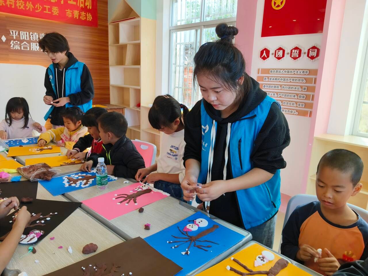 在赤东村,志愿者们开展了“巧手迎小雪,童心暖寒冬”创意手工活动。带着孩子们一起探索无限的创造力,让他们的想象力在这次课程中得到发展,展现出独特的艺术天赋。孩子们用粘土创造出了一幅幅属于自己的、独一无二的作品。